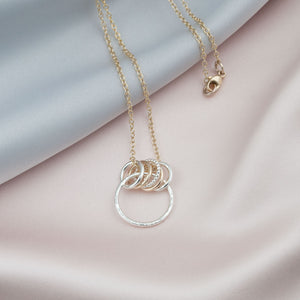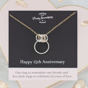 Celebrate this extra special occasion with one of our 15th anniversary necklaces. This silver and gold necklace features a pendant made up from one large ring to represent one decade and five smaller adjoining rings to symbolise five years, taken together this unique combination of rings forms the basis of a wonderful keepsake to commemorate 15 years of marriage. The special meaning behind the pendant is highlighted on a complimentary gift card bearing the message 'One ring to remember one decade and five little rings to celebrate 15 years of love'. The rings that make up this pendant are handcrafted from 925 sterling silver and 14ct gold-fill wire.