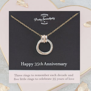 Celebrate this extra special occasion with one of our handmade 35th anniversary necklaces. This silver and gold necklace features a pendant made up from three large rings to represent three decades and five smaller adjoining rings to symbolise five years, taken together this unique combination of rings forms the basis of a wonderful keepsake to commemorate 35 years of marriage. The special meaning behind the pendant is highlighted on a complimentary gift card bearing the message 'Three rings to remember each decade and five little rings to celebrate 35 years of love'.