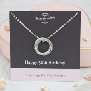 50th Birthday Necklace – 5 Rings for 5 Decades – Sterling Silver – Textured