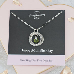 This 50th birthday necklace with birthstone would make an ideal gift for any woman who is just about to turn fifty. It features a pendant made up from five interlocking rings to represent each of the five decades the recipient is celebrating. The rings are all free-moving and measure approximately 19mm in diameter. The rings symbolise wholeness, strength, unity and everlasting love and they come in a combination of different textures including hammered, lined, beaded and plain.