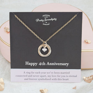 This delicate silver and gold necklace would make an ideal 4th anniversary gift. Handcrafted from 925 sterling silver and 14ct Gold-fill wire the pendant features a cute little silver heart charm and one free-moving ring for each year you've been together as husband and wife. The four rings are all slightly different to emphasise the fact that each one represents a different year of your marriage and when joined together they symbolise wholeness, strength, unity and everlasting love.