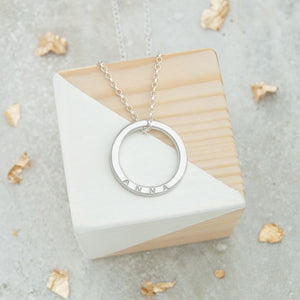 This personalised name necklace features a handmade sterling silver ring that can be personalised with any name, word or date up to 18 characters in length. The ring/circle has a diameter of approximately 23mm and it comes suspended on a sterling silver chain in a length of your choosing.