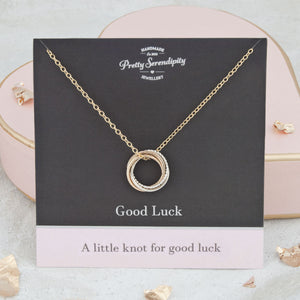 This cute little necklace would make a fabulous good luck gift. Handcrafted from 925 sterling silver and 14ct gold-fill wire it features a knotted pendant made up from four interlocking and free-moving rings that when joined together symbolise strength, unity and everlasting love. The special meaning behind the necklace is highlighted on a complimentary gift card bearing the message 'A little knot for good luck'.