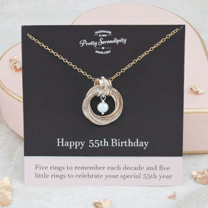 Celebrate her 55th birthday with one of our handmade silver and gold birthstone necklaces. The sentimental idea behind this gift is that the five larger ring represent five decades and the five smaller adjoining rings symbolise five years, taken together this unique combination of rings forms the basis of a wonderful keepsake to commemorate 55 years of memories.